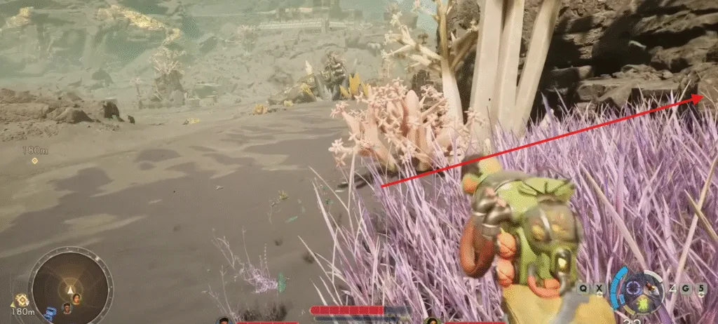 Just when the light purple grass ends, head to your right and climb up.