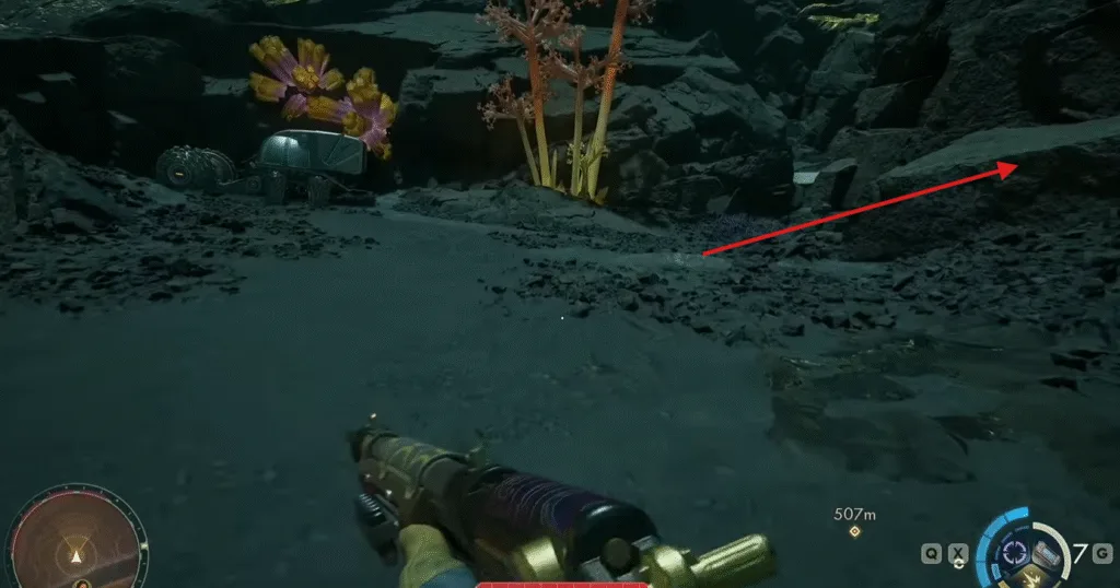 Keep in mind that this place is full of gas, so don’t forget to equip a good gas energy deflection apparatus. Straight up, ahaed you will find the land pod behind the stone memorials kind of thing.