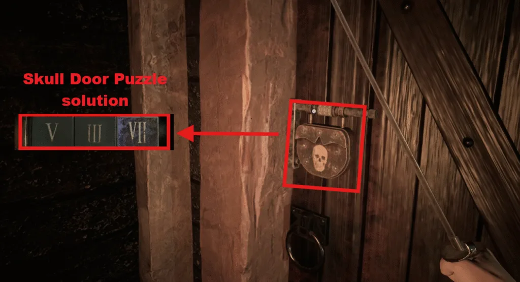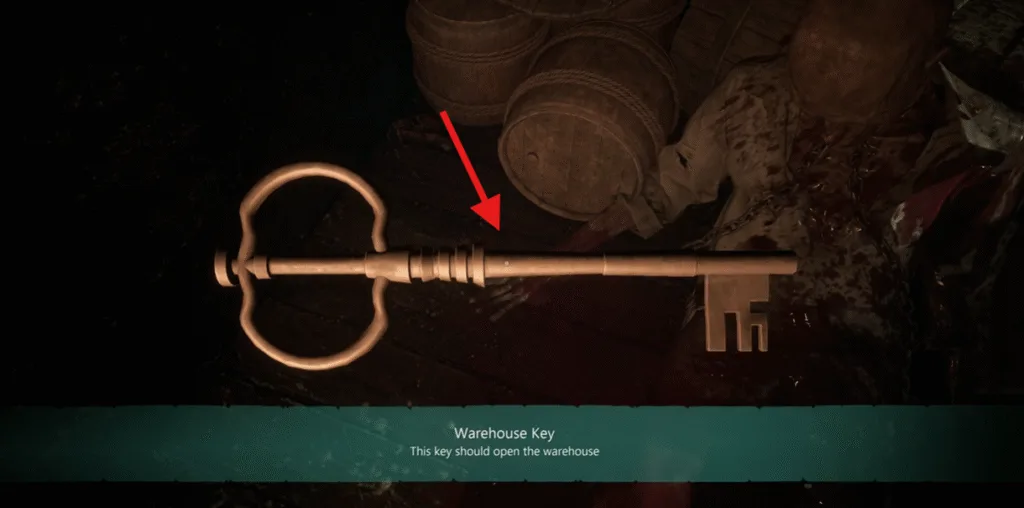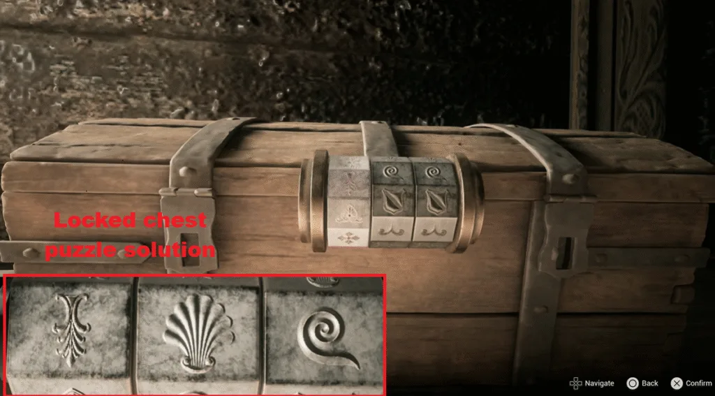 Once you wake up on the ship right near the cell entrance, you will spot a locked chest with symbols on it. The door to your right needs a key that you will get by going back and interacting with the Lantern will light it up. The lantern will show a dead body beside it, and in his right hand is the key to the Warehouse that you need to open to get the clue to open the chest.