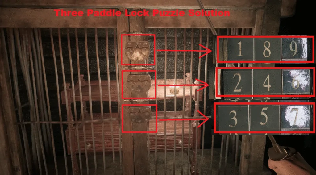 Eventually, you will reach an area with a cage and a glowing blue skull locked inside it. The cage is secured by three padlocks, each requires a different combination