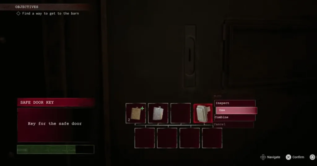 Make your way into the basement, where you will need to use the Safe Door Key to open the slot for the combination lock. Put the code: Left 39, Right 12, Left 39.