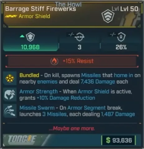 | Trigger Effect (Missile Swarm) | On Armor Segment break, launches 3 Missiles, each dealing 1,487 Damage |