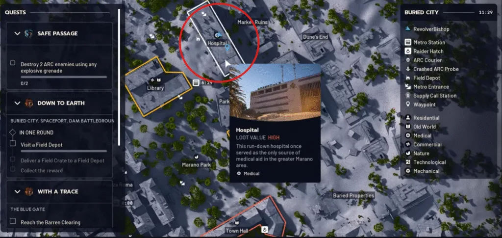 After getting the key, open the world map and inspect the Buried City. In that area, set way waypoint to the Hospital, which is a high loot building in ARc Raiders.