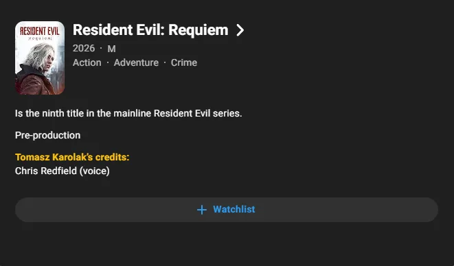 It’s also worth noting that Chris has historically been voiced by actors such as Roger Craig Smith, David Vaughn, Jeff Schine, and Kevin Dorman across various Resident Evil titles. Tomasz Karolak has no prior record of video game voice acting, which raises further questions about the accuracy of the IMDb listing.