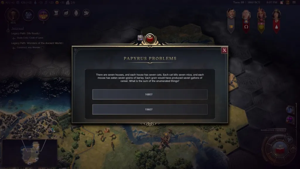 Civilization 7 features the Papyrus Problems which is a direct reference to the Problem 79 of the Rhind Mathematical Papyrus, an ancient Egyptian text dating to around 1550 BCE.