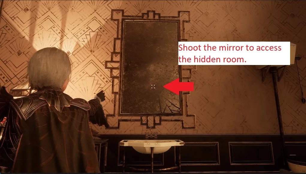 The door leads to the bathroom and inside the bathroom shoot the mirror on the wall to reveal a hidden area.