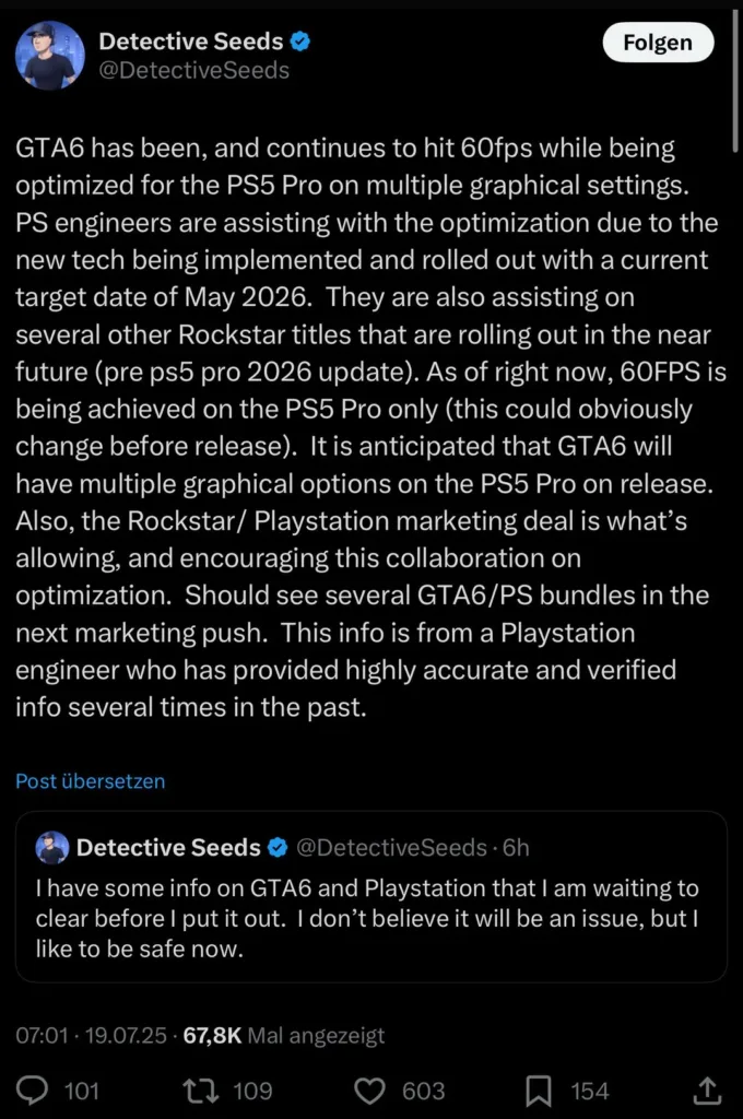 GTA6 has been, and continues to hit 60fps while being optimized for the PS5 Pro on multiple graphical settings,” Seeds wrote, adding that the current target release date is May 2026.