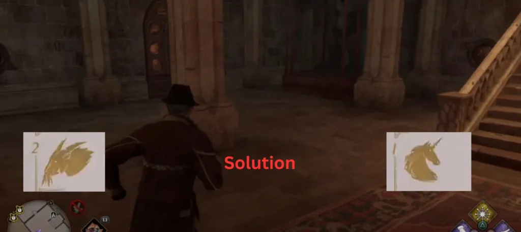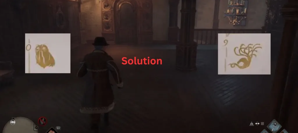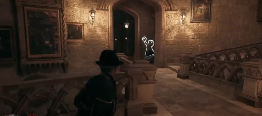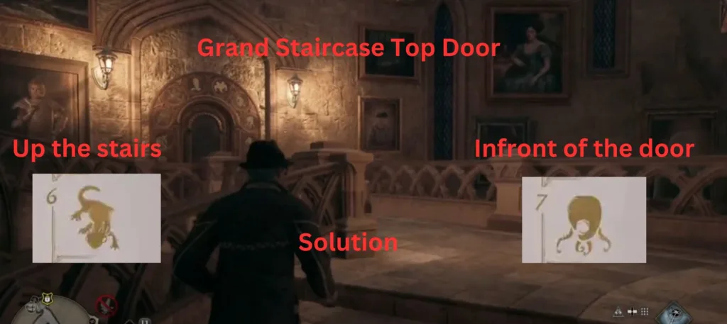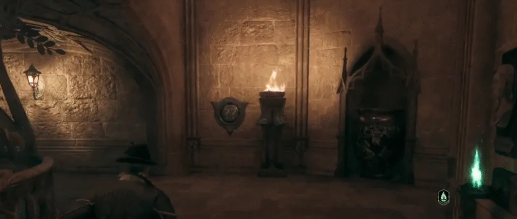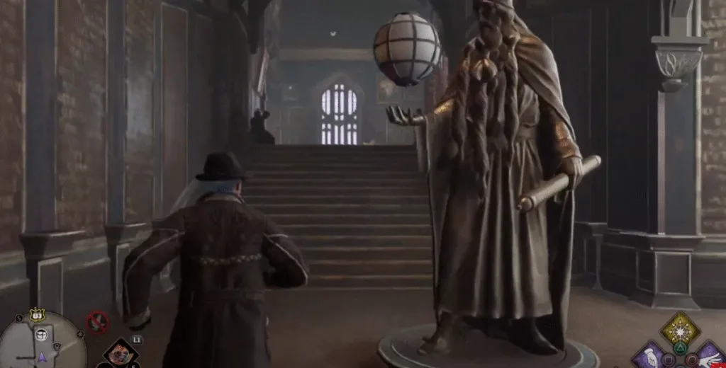 Next, go back to the point from where we came and head towards the transfiguration courtyard and head to the Defence Against Dark Arts tower. Take the right upon entering the tower and go up to the fifth floor. The next puzzle door will be towards the left of that statue. You can also go there by using the Floo Flame of the Defence against the Dark Arts tower.