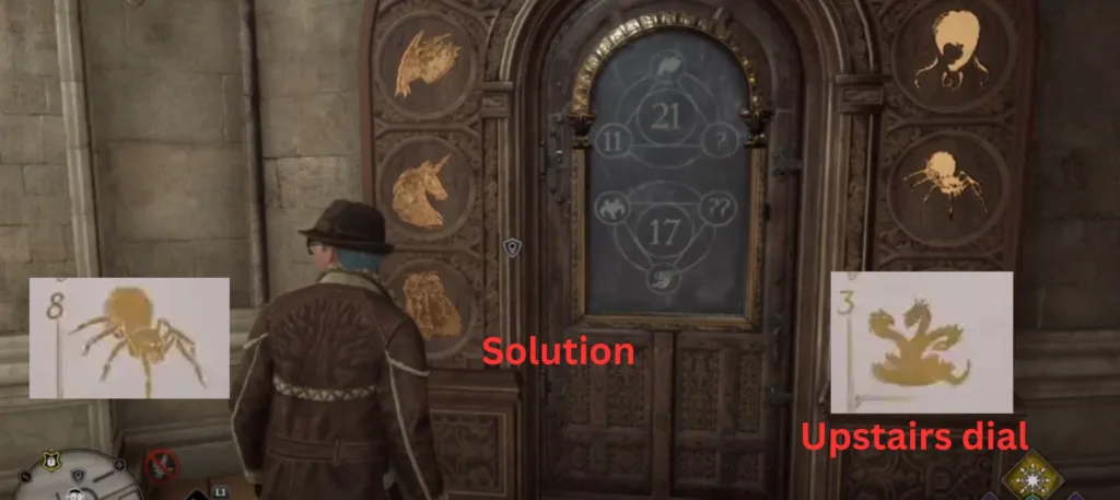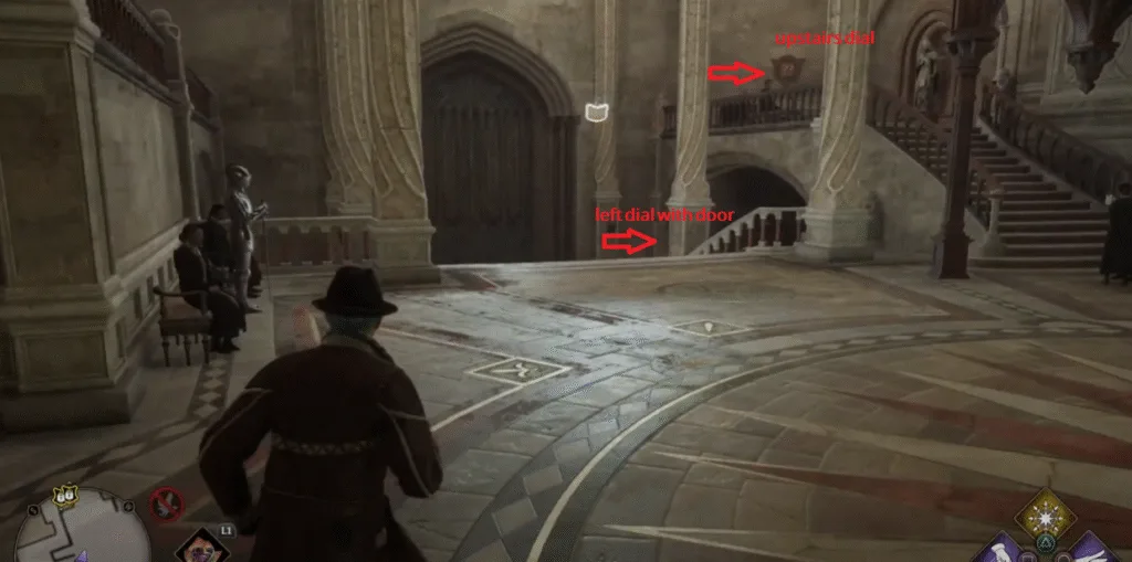 Now go back to the central hall and go to the southwest side of the bottom floor, where you will find the door. One dial of the door is on the left side, while the other is upstairs towards the right. I have provided the picture reference just to be clear.