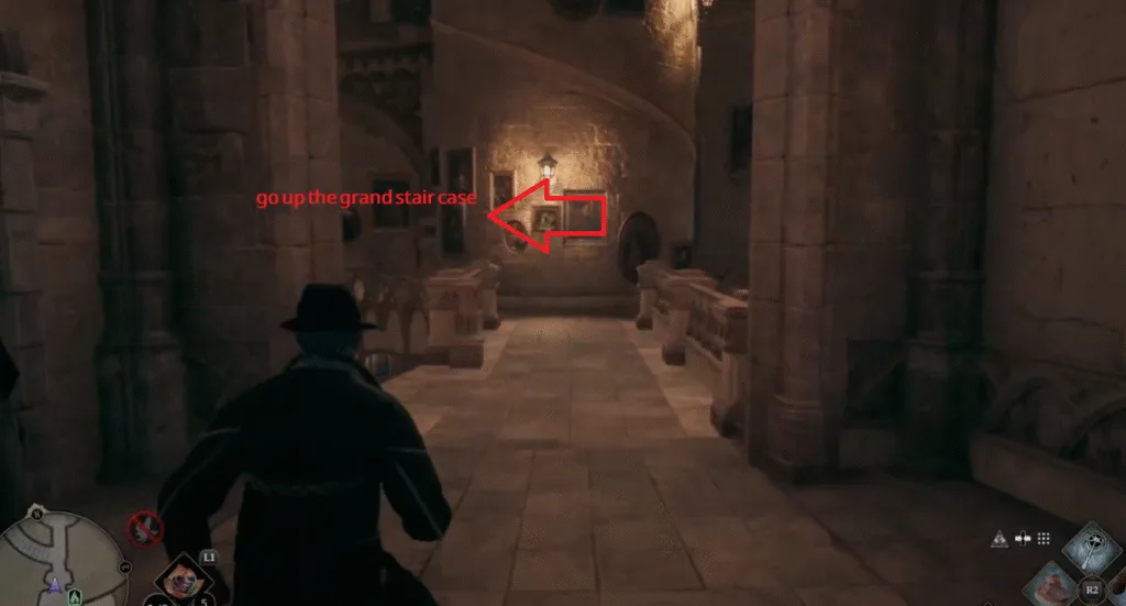 Lastly, use the Floo Flame to access the grand staircase. Rather than going down, go up to the grand staircase.