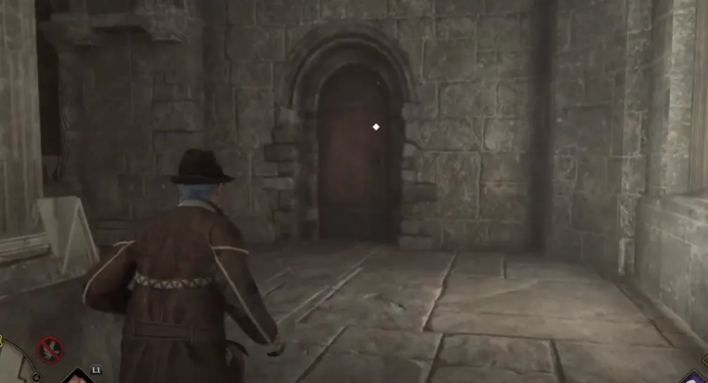 Next door is in the long gallery, go down to the hallway towards the potions classroom. Just after entering, go down the stairs next to the classroom. The door at the end of the path is locked at level 1 locked so you need Alohomora level 1 for this area to access. Near the end, where the stairs are going up, you will see the door to the left.