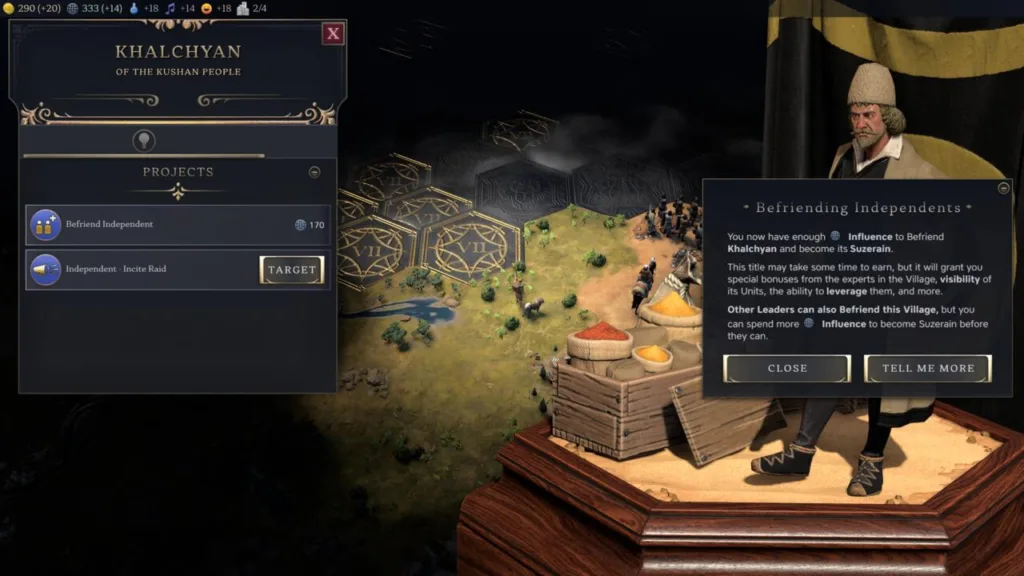 - You will get a menu with two options: “Befriend the Independent” and “Independent – Incite Raid”. Click “Befriend the Independent” to become Suzerain; it costs around 170 Influence to start the Suzerainship process.