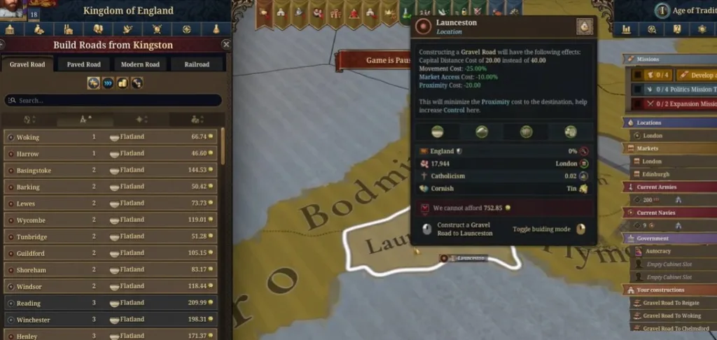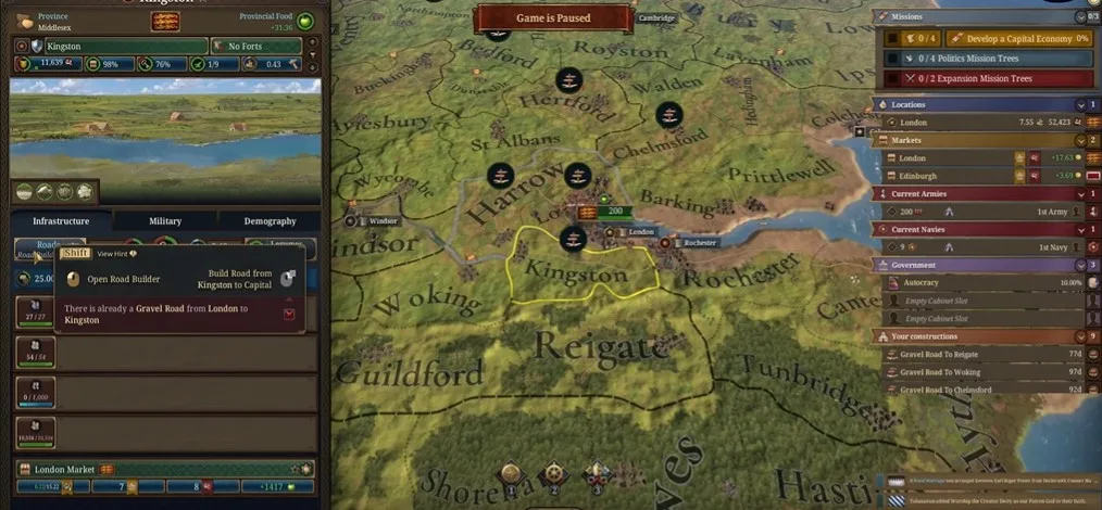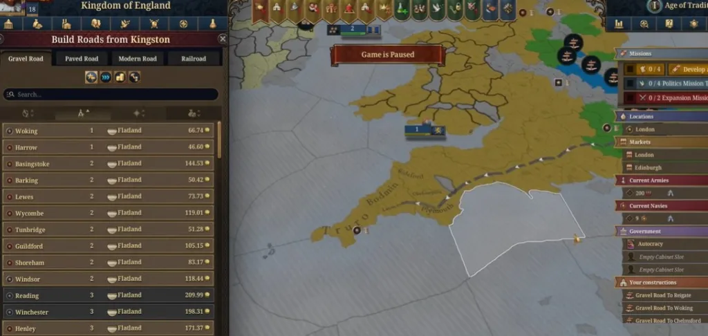 You can also check the progress of the road construction from the construction tab. After the road is complete, proximity will decrease, giving you more control of the province.