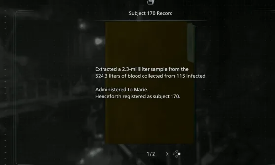The file says that a 2.3 milliliter sample from the 524.3 liters of blood collected from the 115 infected was administered to Marie. This explains why we need to wait for 115 bodies to drop into the pool of blood.