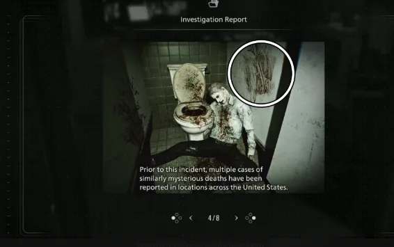 After that, make your way to the Restroom in the West Wing and enter the first stall, where you will need to flush the toilet eight times. The reason is hidden behind the fourth page of the Investigation Report (file), where there is a photo of a corpse by a toilet with an eight written in blood. After that, backtrack to the Blood Lab to find the first letter.