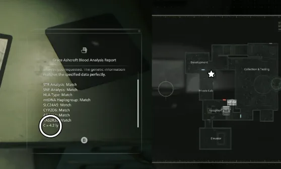 For the next letter, you will have to enter the Private Lab and turn to the left to find Grace Ashcroft’s Blood Analysis Report (file) on the desk. Scroll to the bottom of the file to find the code: C = 4.2 ly. Now, it’s time for a little astronomy class.