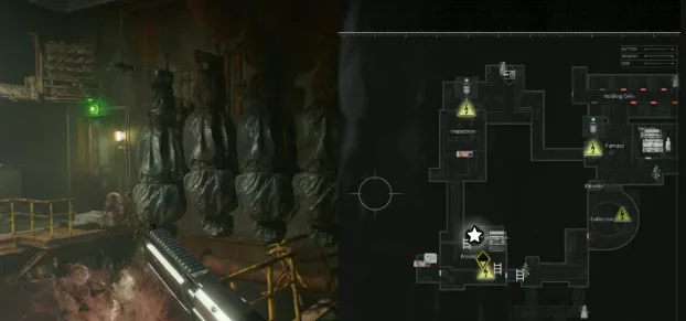 Follow the conveyor belt of hanging bodies into the Processing room and wait for 15 minutes for the corpses to drop into the bloody water. This 15-minute wait seems to be related to the Subject 170 Record (file).