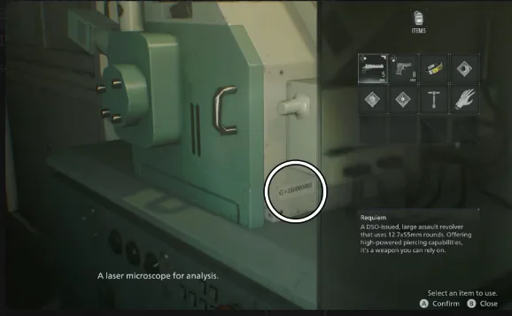 Head back to the Blood Lab and interact with the blood analyzer so that it opens up your inventory. You will see the first code at the bottom corner of the analyzer, which will be G = 150000000.