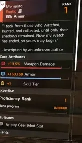 The Memento Exotic Backpack comes with Weapon Damage, Armor, and one Skill Tier as well as a gear mod slot. The Backpack comes with a Kill Confirmed Talent: