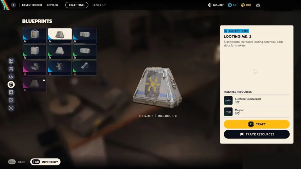 | Looting Mk.2 | Gear Bench Lv. 2 | • 2× Electrical Components • 3× Magnet |