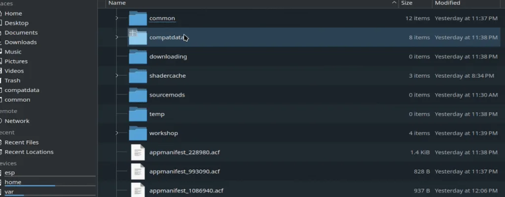 From the Steam apps folder, open compatdata, where you will see some numbered folders.