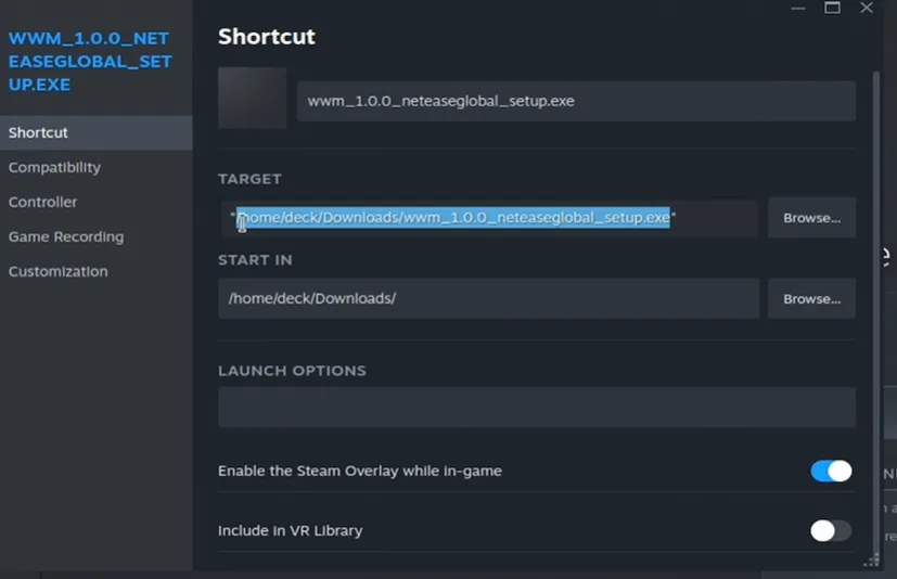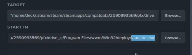 and then paste the same path in the START IN, just delete the launcher.exe from this.