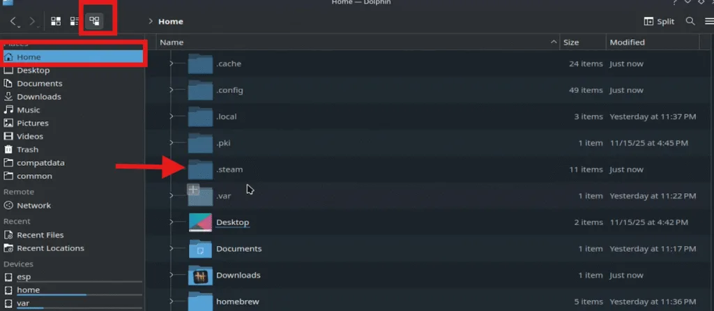 Now open the home folder and unhide all the files in the folder. Open .steam and then steam folder to selct Steam apps.