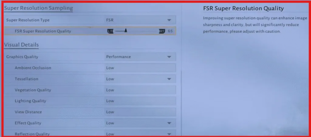 Inside the game, go to the settings menu and switch the performance preset to the first (low settings). Enable FSR and adjust your resolution scaling to approximately 65%. This setup typically results in gameplay around 40 to 50 FPS—far better than the original Steam version.