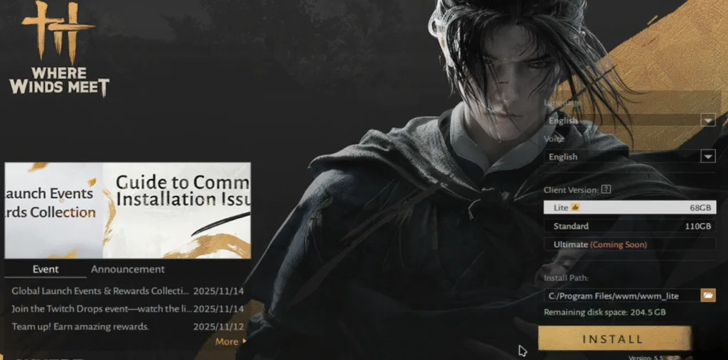 You can also rename the short cut name to Where Winds Meet Lite. If you have done everything right now Launch the game and you will get a choice for client Lite(68 GB) or standard version(110 GB). By deafult Lite version is selected, if not choose it and start the instalation.