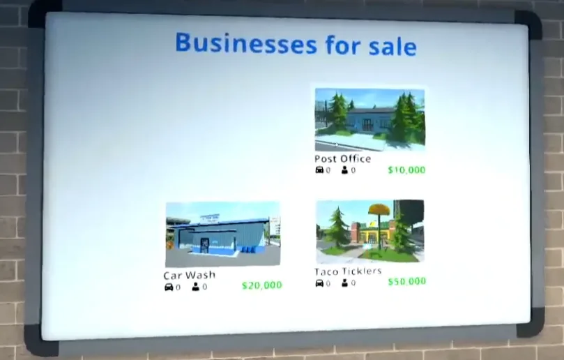 To buy any business, you need to go to Ray’s Realty, where you can buy a Laundromat, Post Office, the Car Wash and Taco Ticklers. You can see the location of the realtor on the map below.
