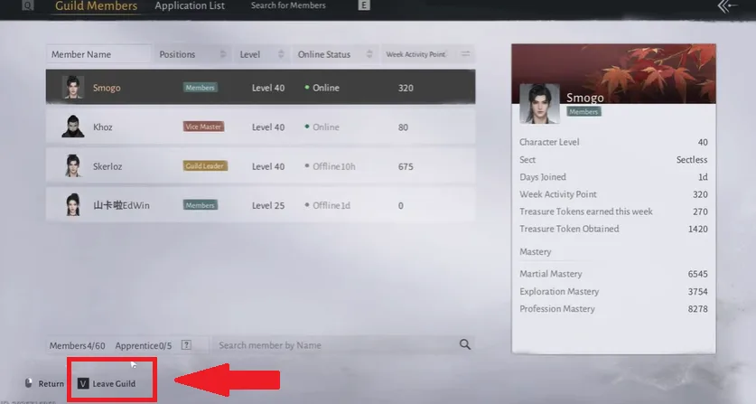 - The view option will show all the details of each member that including their position, level, online status, etc. On the same screen in the bottom left corner of the screen, there is Leave Guild that you can also access by pressing V.