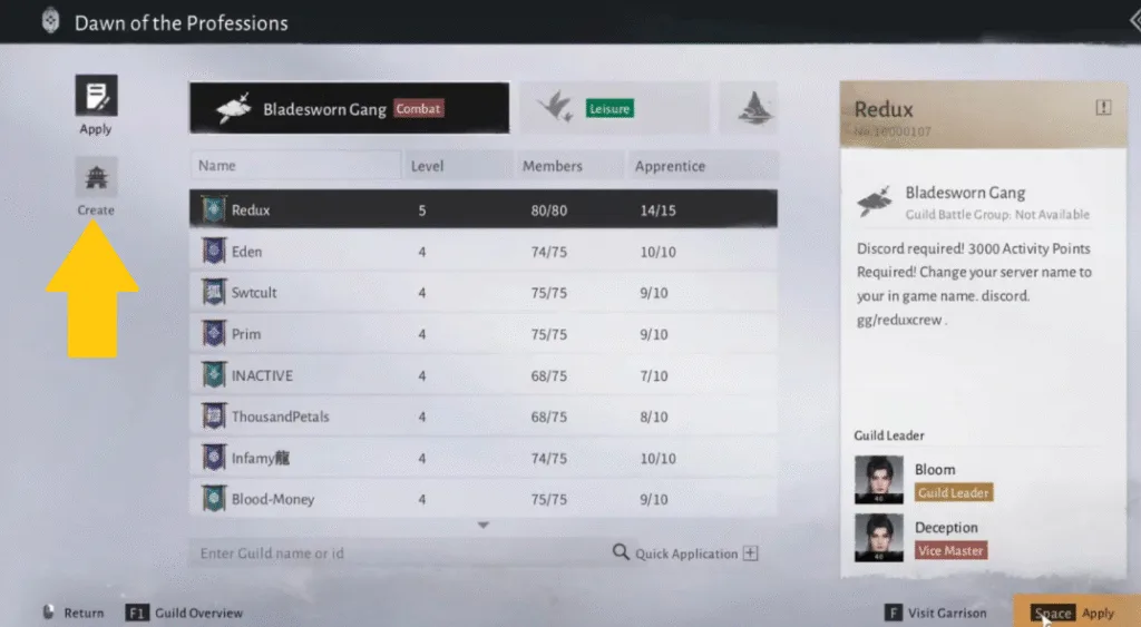 - This will show you multiple new guilds that you join. Under the Apply button, you also have the choice to create a new guild.