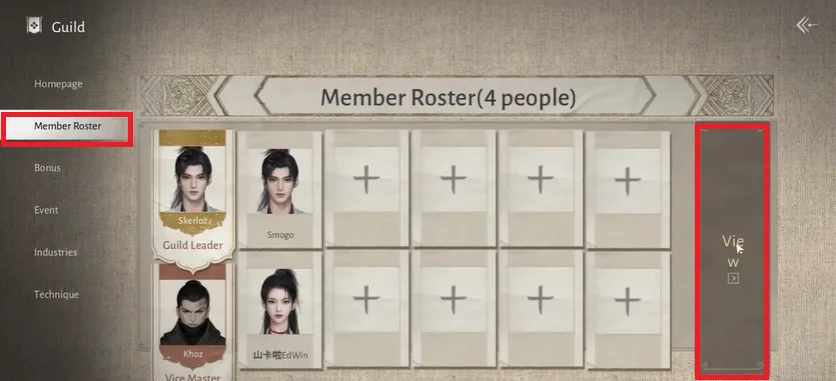 - In the roster menu, you will see the details of the guild members, and in front of that box, you will see the view option. Click on that.