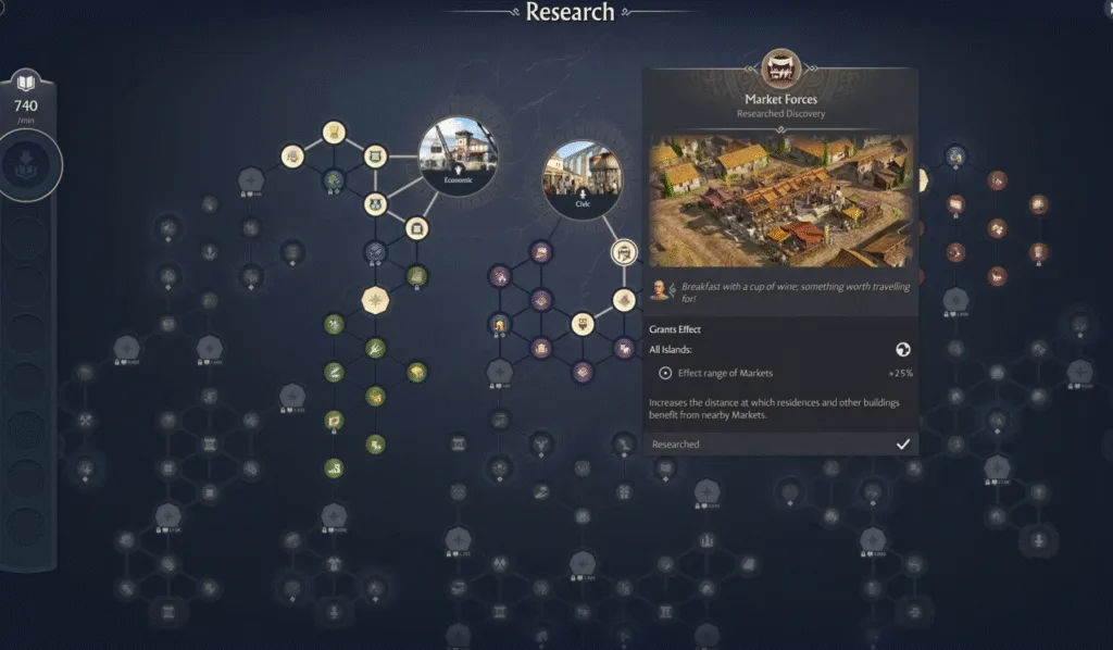 Research improves your economy through reduced upkeep, larger AoE and increased income modifiers. As the research tree is quite big, which is pretty impressive, choose wisely by focusing on the ones that boost production chains or AoE effectiveness. One of the good research that you can pick on early is: