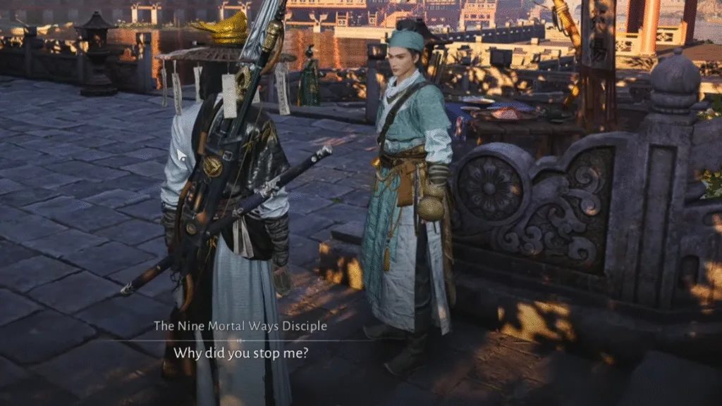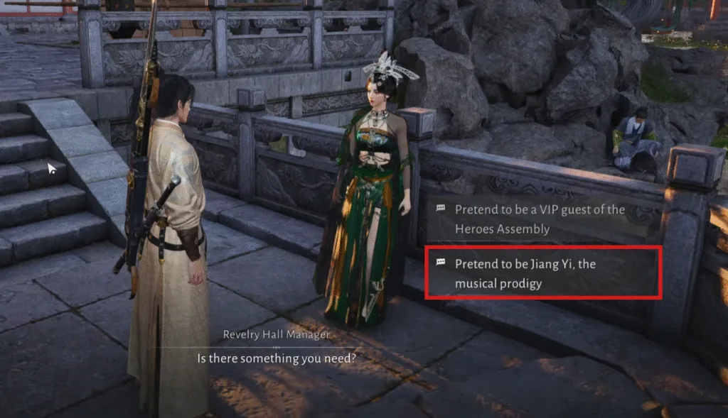 After you are disguised as Master Juang Yi, talk to the Revelry Hall Manager to enter the assembly hall, and two dialogue boxes will appear from which you have to choose: