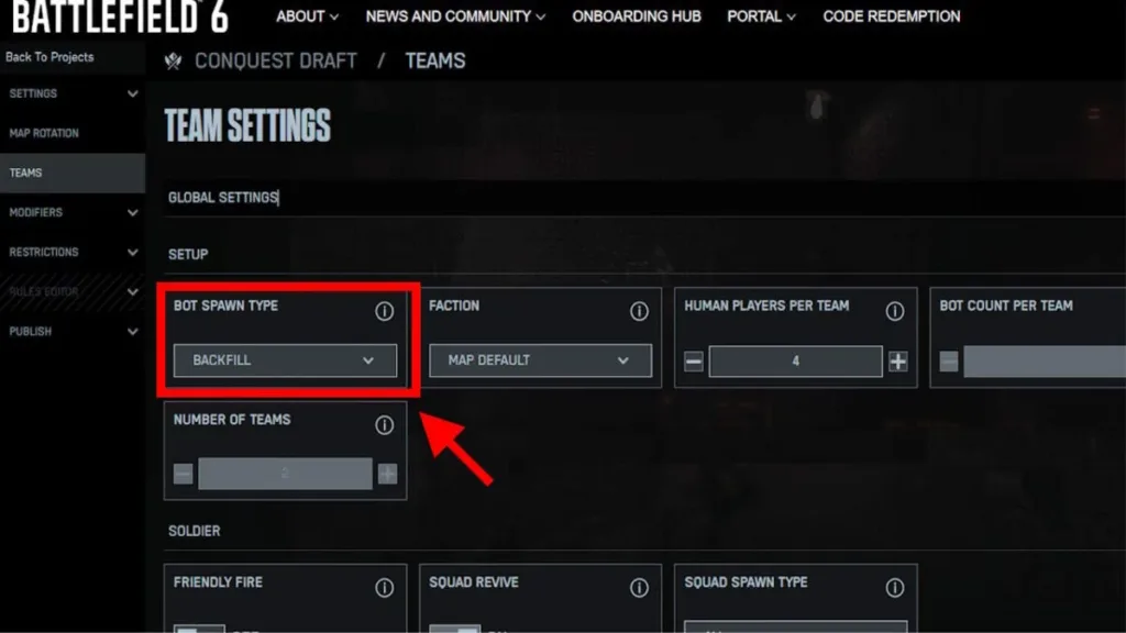 - Now you can add bots to your game. After selecting the game mode the next page will have the option called “Bot Spawn Type.” From this drop down menu select the “Backfill” option.