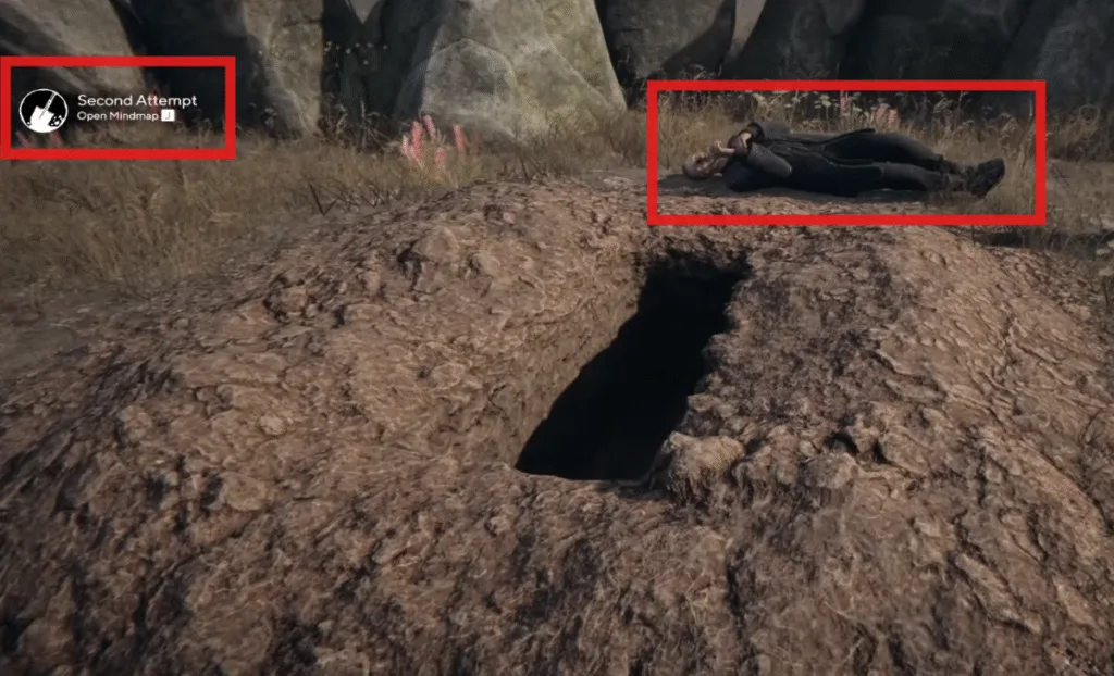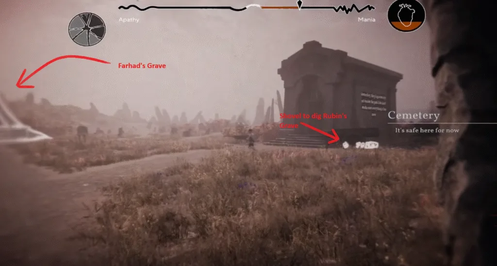 To locate Rubin’s Grave, head left from Farhad’s grave to the path where you can see a bunch of crows hovering over. The crows are an indication of Rubin’s grave. Interact with the Rubins’ grave and dig it using the shovel, but it’s too late; he’s already suffocated and died. This will open a minimind map of the Second attempt.