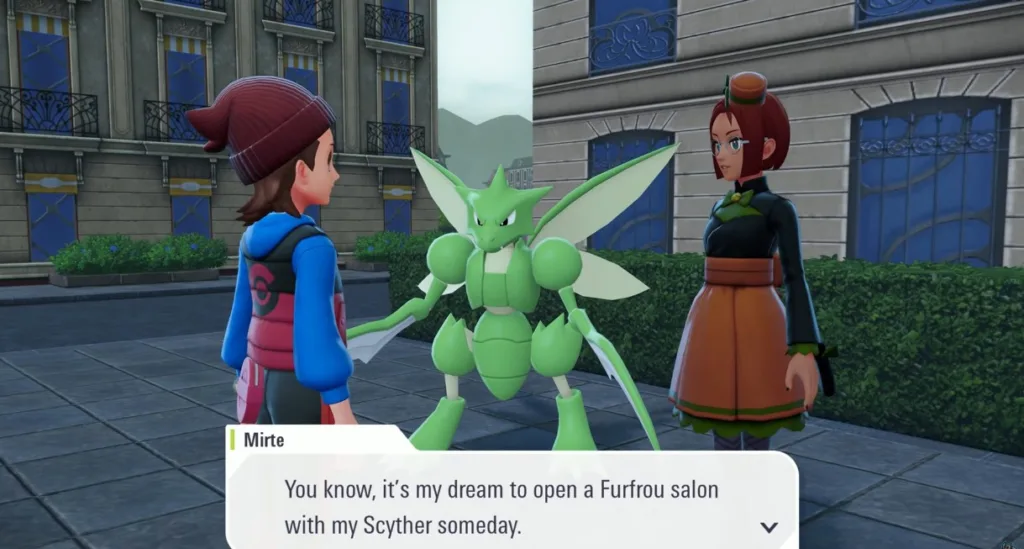 Head there and talk to the NPC character Mirte, who wants to open a Furfrou salon along with her Scyther Someda. However, she wants her Pokémon to learn some moves before she can start trimming the Furfrou to unlock different forms.