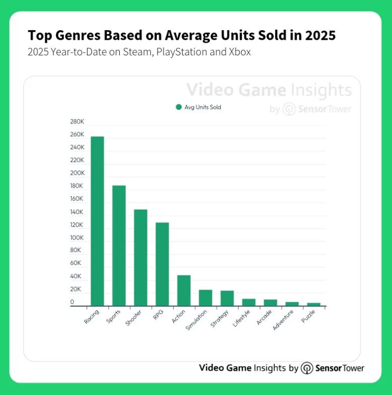 According to aggregated sales data (by Sensor Tower) across Steam, Xbox, and PlayStation, the Racing genre is currently in pole position for 2025, with each title averaging around 262,000 units sold.