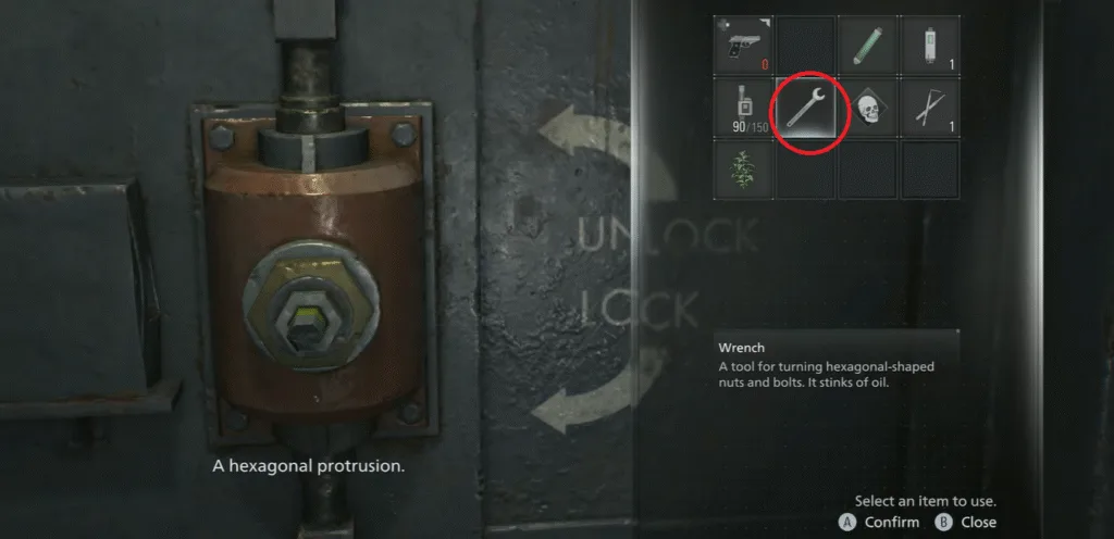 Now that you have the lungs, go to the Cold Storage to find the Heart. Interact with the door and the crank on the door will come off, as Grace tries to open the door. This is where the Wrench becomes useful. Interact with the door again, select the wrench, and the door will open.