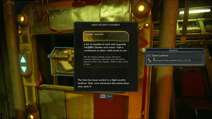 Valerie is a companion who appears early in the game aboard your ship, the Incognito. Near her, in the ship’s cargo bay is a lockbox that can initially be opened with a single Advanced Decryption Key she provides to you. Opening this first lockbox grants you the “Auntie’s Acidic Dematerializer” gadget.