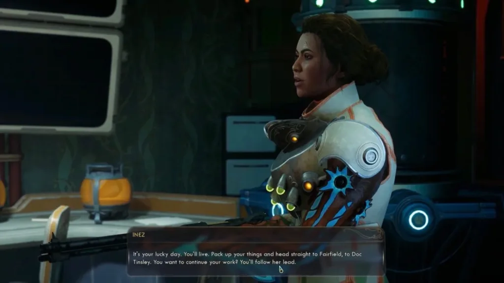 Inez will shoot the Doctor in the head. Head back to Ethel’s Lab at the Fairfields to end the “A Most Extraordinary Specimen” companion quest in The Outer Worlds 2.